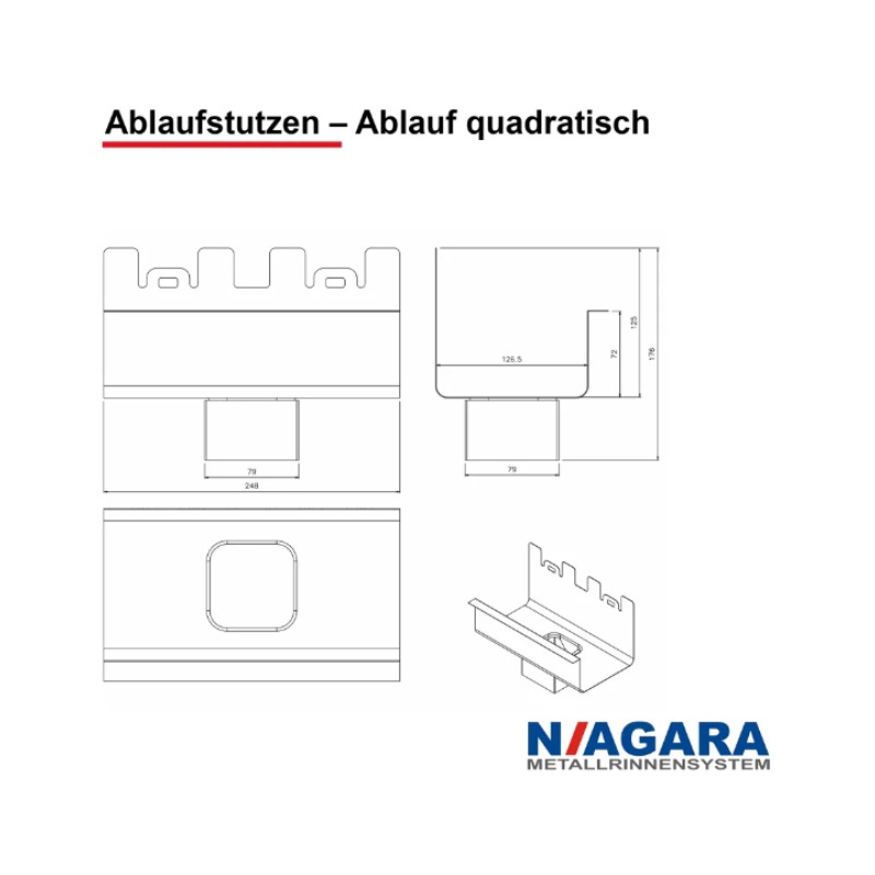 Unser quadratischer Ablaufstutzen ist ein zentrales Verbindungselement im NIAGARA Kastenrinnensystem. Er dient als Bindeglied zwischen der Kastenrinne und dem eckigen Fallrohr und sorgt so für einen kontrollierten Wasserablauf vom Dach. Durch seine passgenaue Form und einfache Handhabung lässt sich der Ablaufstutzen mühelos montieren – ideal für Profis und Heimwerker gleichermaßen.
